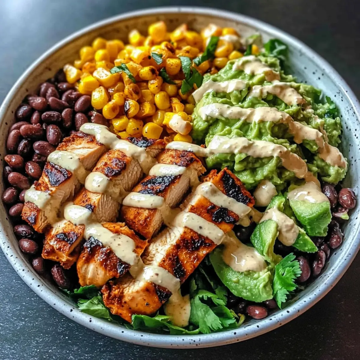 - Schüssel zusammenstellen: Bohnen in einer Schüssel verteilen, darauf Mais und geschnittenes Hähnchen legen. Mit Avocado, Sauce und Koriander garnieren.