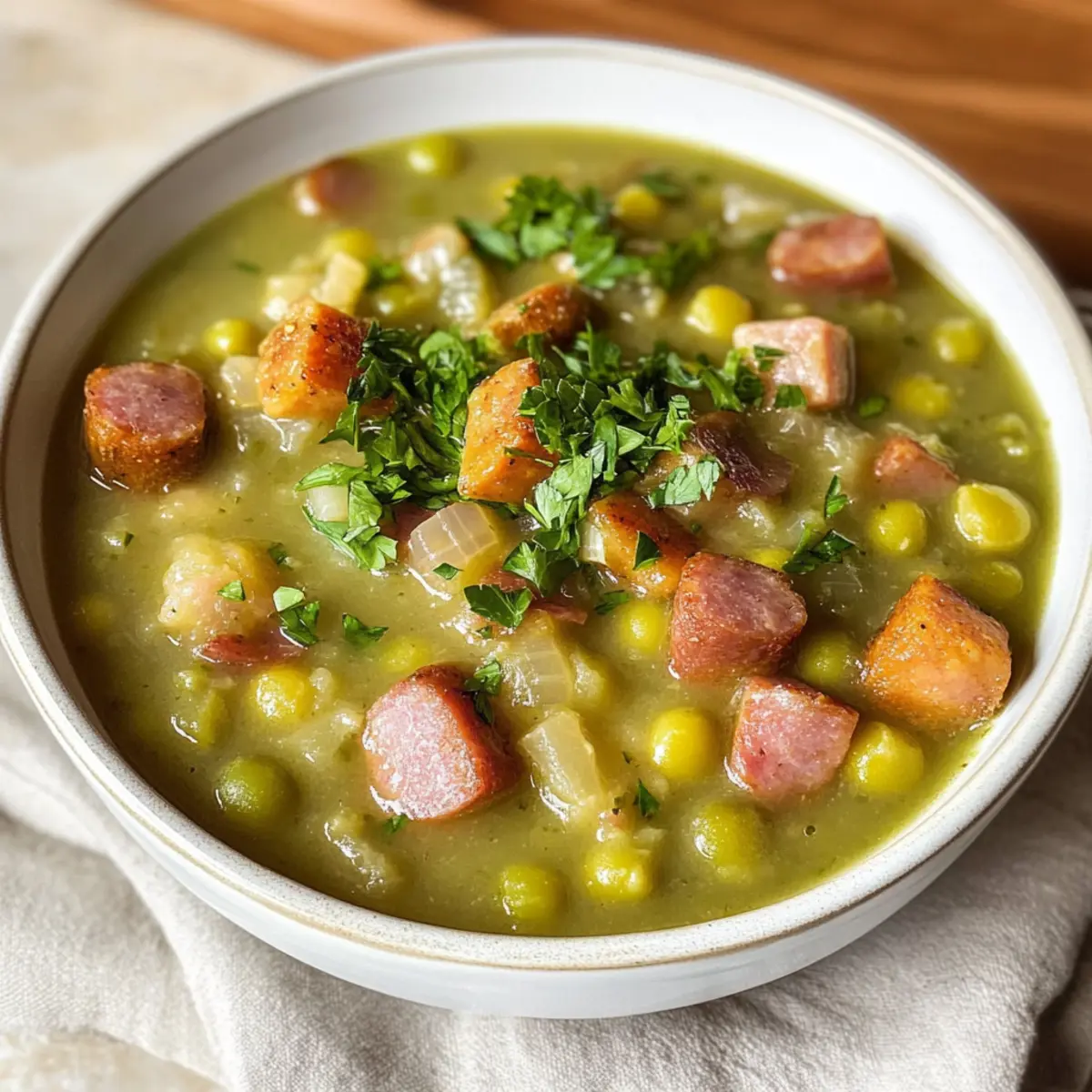 Aromatischer Genuss: Die Kombination aus Erbsen, würzigem Speck und beliebten Gewürzen sorgt für ein Geschmackserlebnis, das Erinnerungen weckt.