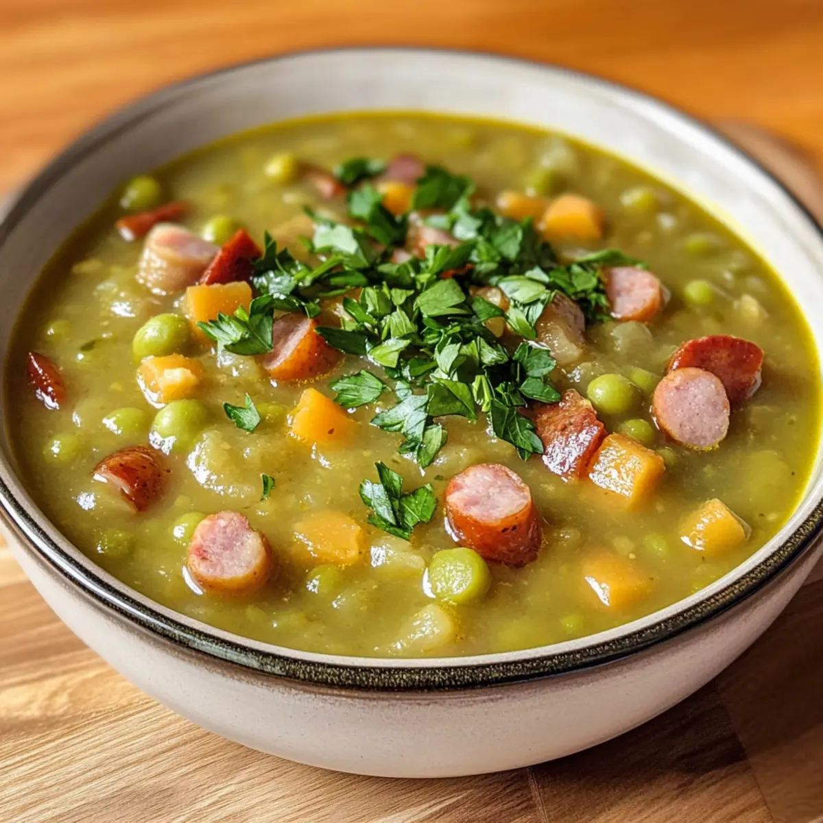 Einfachheit und Genuss: Diese herzhafte Erbsensuppe ist leicht zuzubereiten und benötigt nur wenige Zutaten, die in jeder Küche zu finden sind.