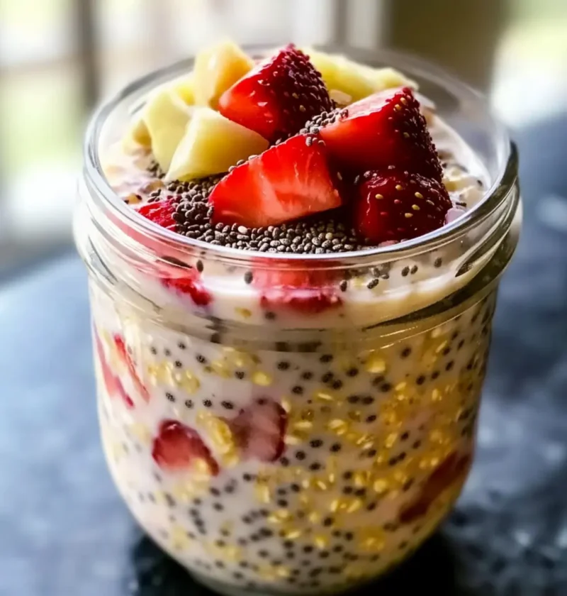 - Am nächsten Morgen gut umrühren und servieren, garniert mit frischen Erdbeeren und optional mit Nüssen oder Samen.