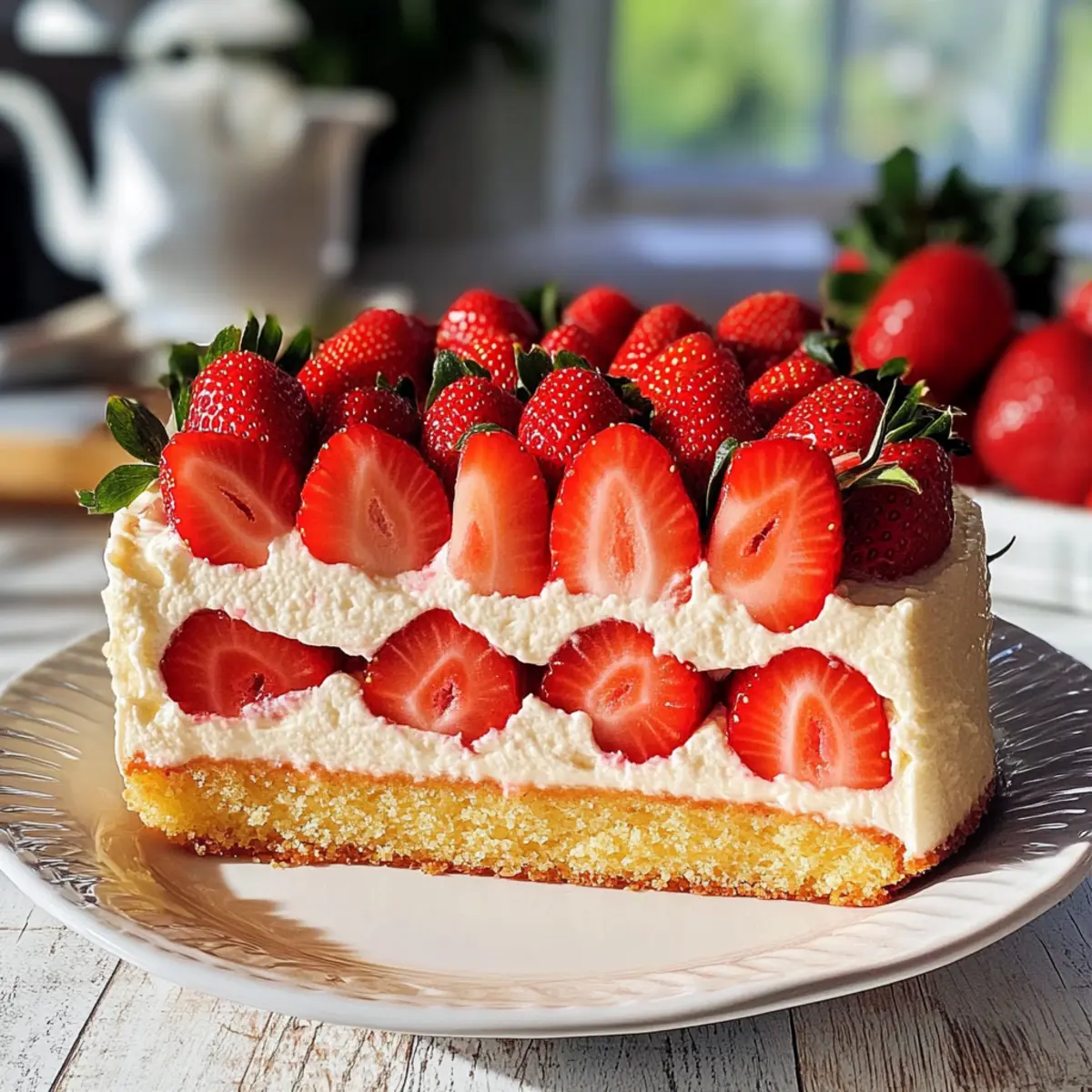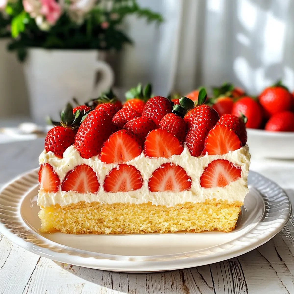 Schlagsahne: Eine luftige Wolke aus Schlagsahne fügt einen cremigen Kontrast hinzu und verstärkt die Süße des Erdbeerkuchens.