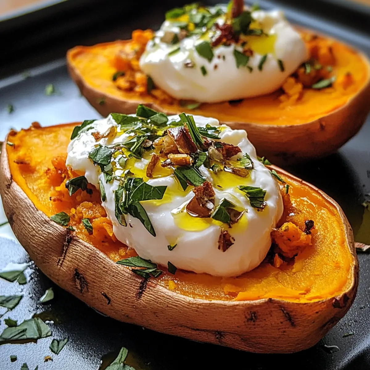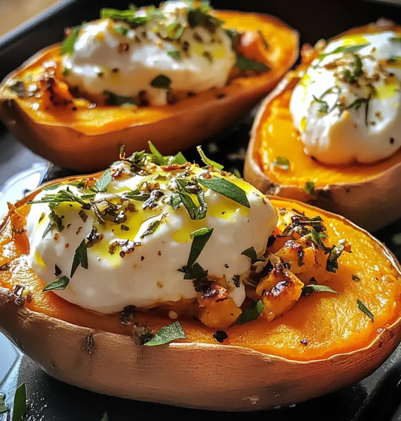 Genießen Sie gefüllte Süßkartoffeln mit Burrata, eine gesunde und luxuriöse Speise, die jedem Anlass gerecht wird.