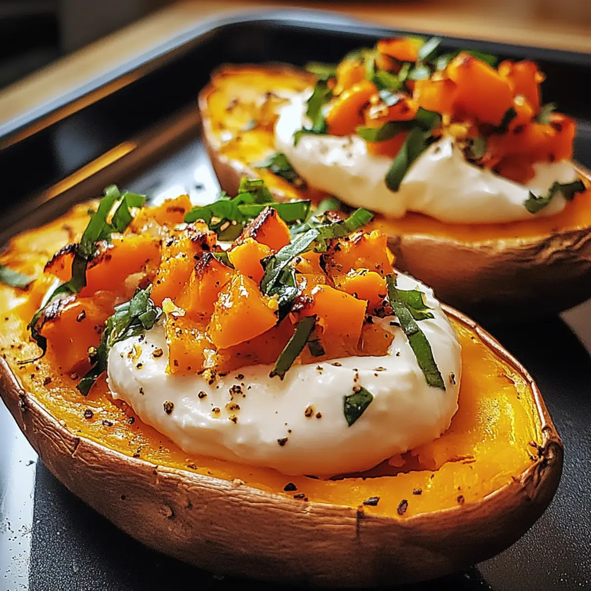 Anrichten für Wow-Effekt: Garniere die gefüllten Süßkartoffeln mit frischen Kräutern und einem Tropfen hochwertigem Olivenöl, um sie appetitlich aussehen zu lassen.