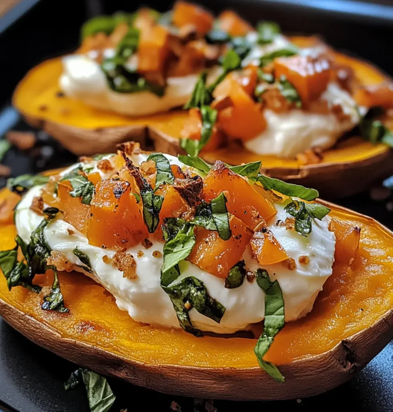 Gefüllte Süßkartoffeln mit Burrata sind eine köstliche Mischung aus natürlicher Süße und cremigem Käse.