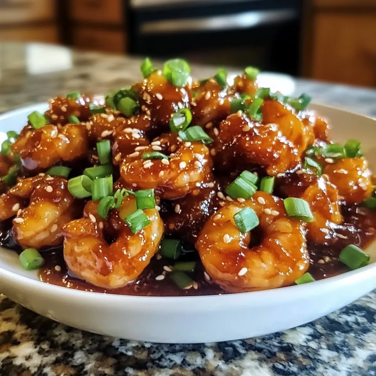 - Garnieren und servieren: Die Garnelen auf einem Teller anrichten und mit Frühlingszwiebeln und Sesamsamen garnieren.