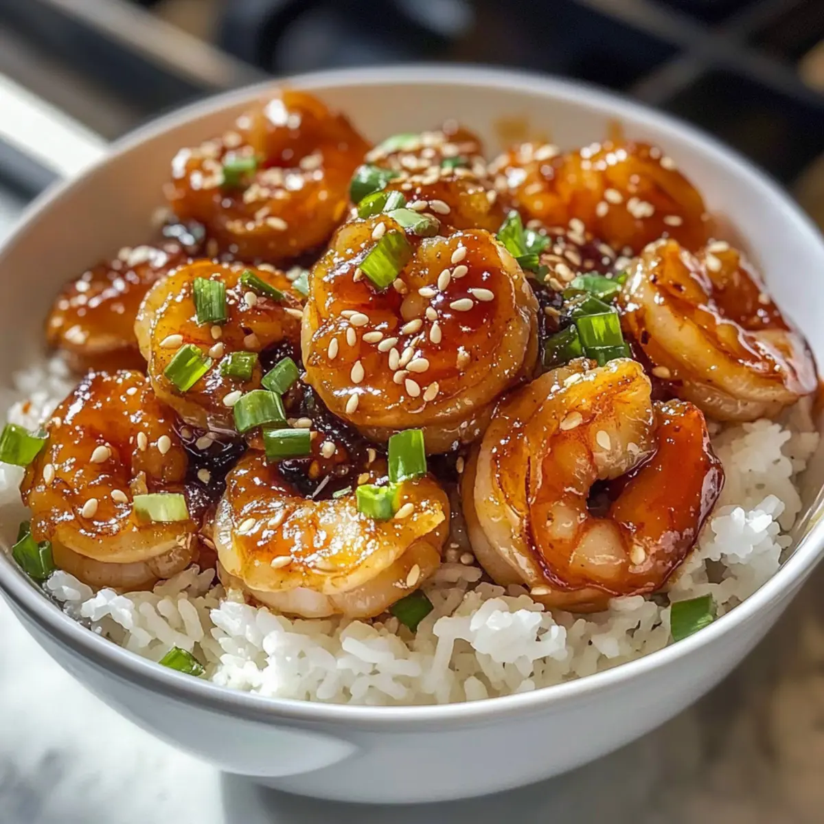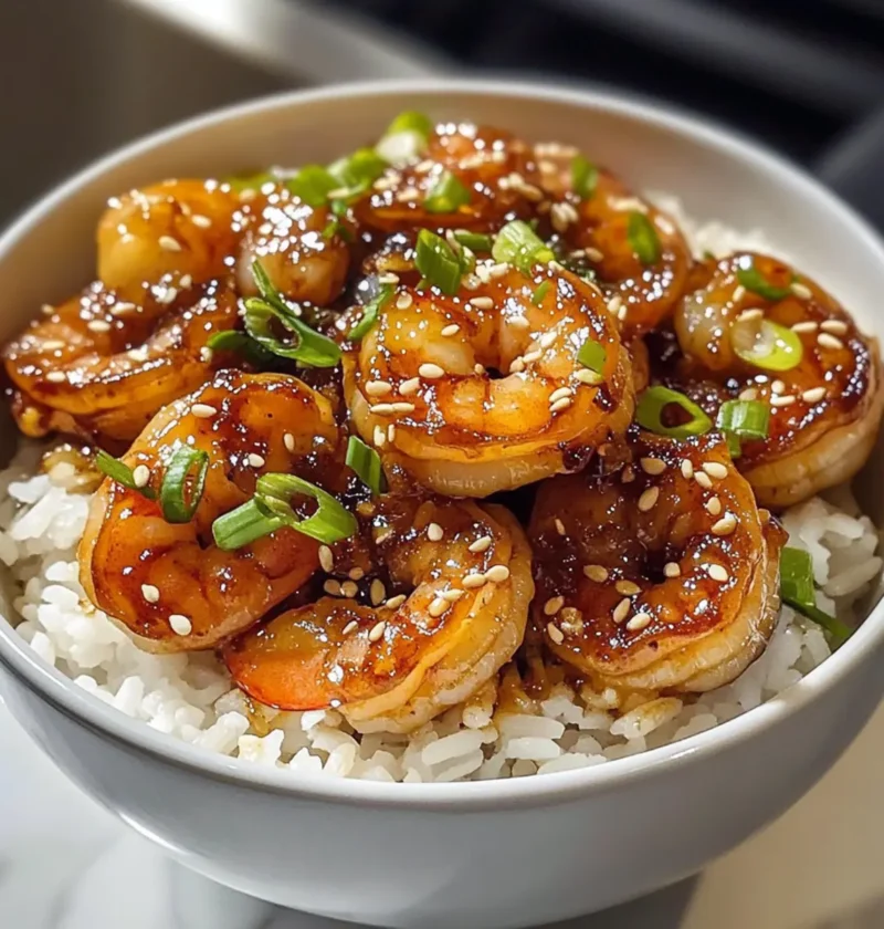 - Richte die Garnelen zusammen mit der Sauce auf dem warmen Reis an und garniere sie mit Frühlingszwiebeln und Sesamsamen.