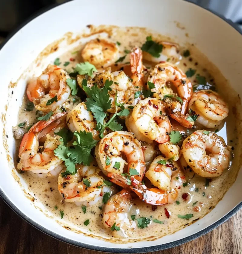 - Die vorgebratenen Garnelen wieder in die Pfanne geben und die gehackte Koriander unterrühren. 1 Minute köcheln lassen, bis die Garnelen durchgehend heiß sind.