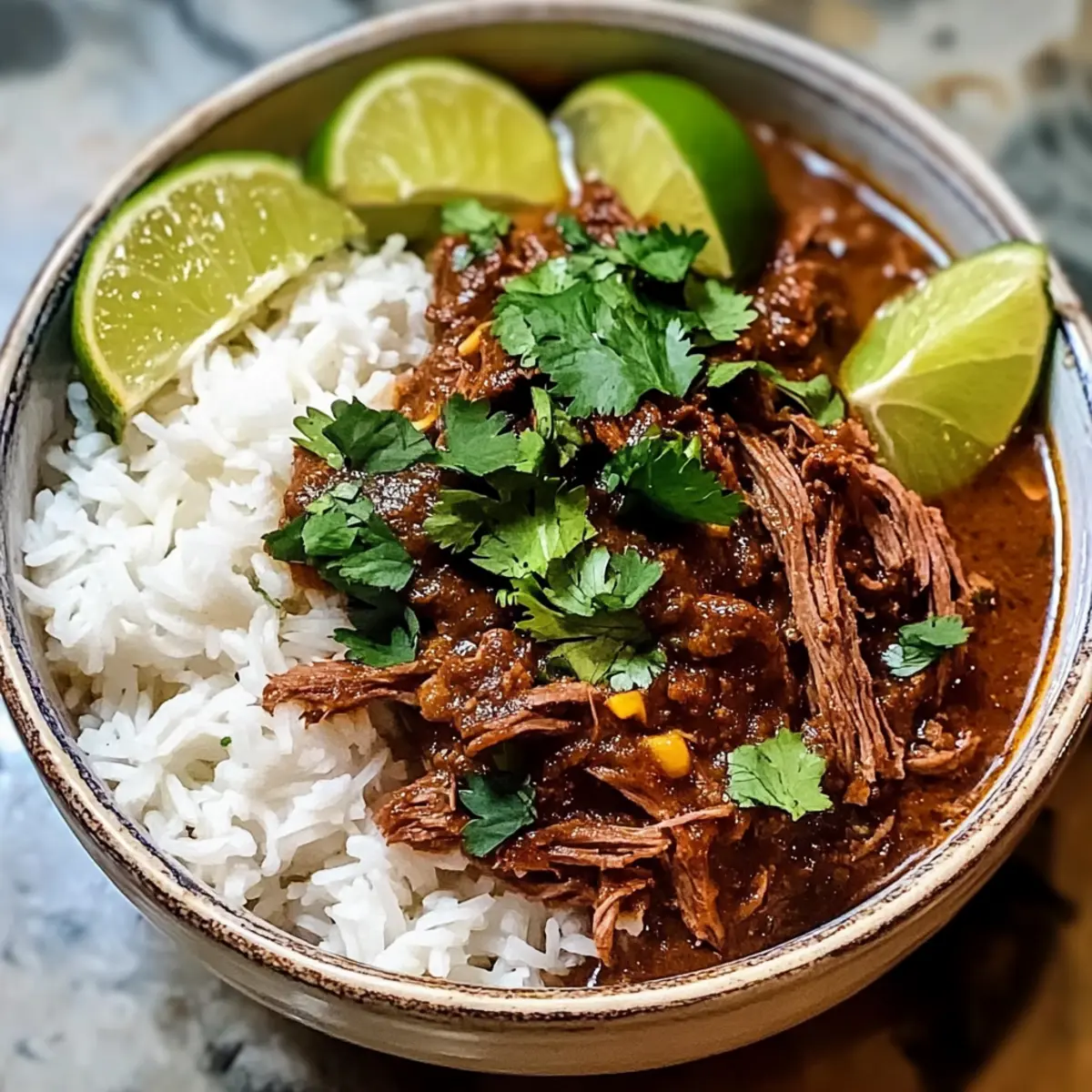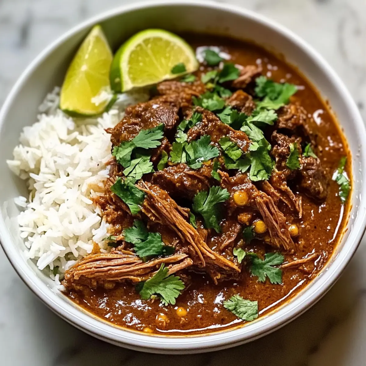 Das Rindfleisch aus der Sauce nehmen und mit zwei Gabeln zerrissen. Dies ermöglicht es, das zarte Rindfleisch gleichmäßig in die Sauce zu integrieren. Limettensaft hinzugeben und die Mischung 5-10 Minuten unbedeckt köcheln lassen, um die Sauce zu verdicken und die Aromen zu intensivieren.