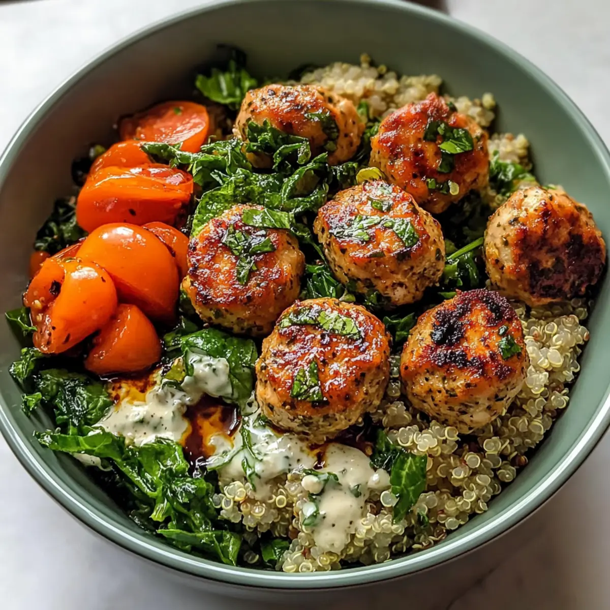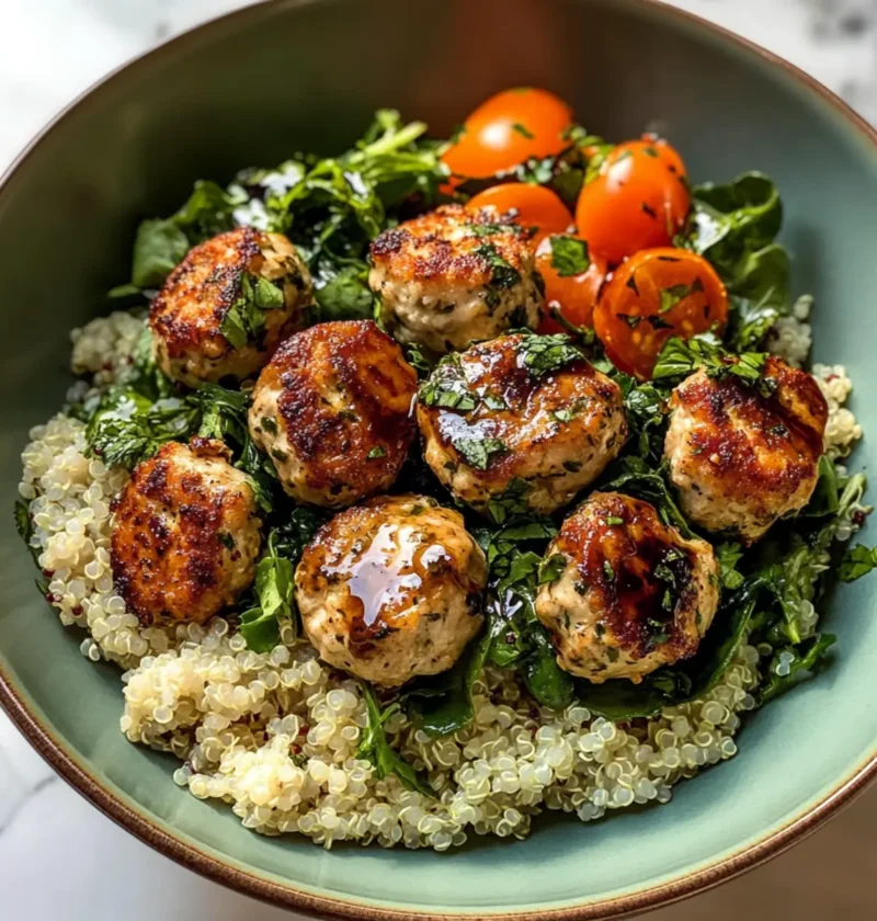 Kräuter-Hühnchen-Fleischbällchen-Schüssel Rezept, das eine gesunde und proteinreiche Option bietet.