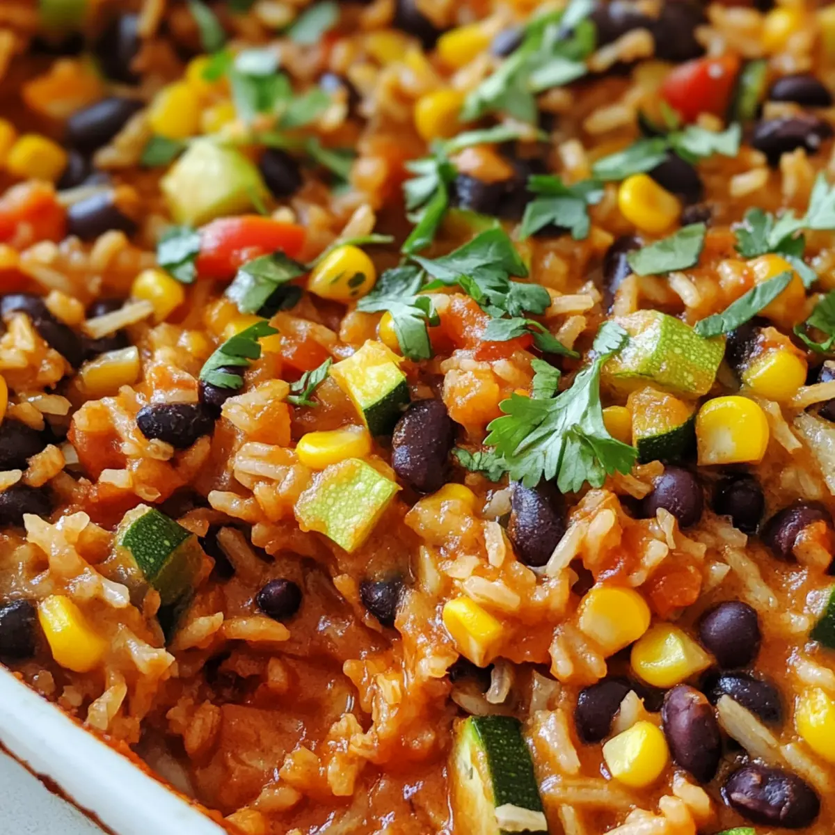 Nimm eine große Auflaufform (23×33 cm) und gib den weißen Reis, die vorbereiteten Bohnen, den Mais, das geschnittene Gemüse, Kokosmilch, Passata und das Wasser hinzu. Füge die Gewürze (Salz, Kreuzkümmel, geräuchertes Paprika und Pfeffer) hinzu und rühre alles gut um, sodass der Reis gleichmäßig mit den Aromen bedeckt ist.