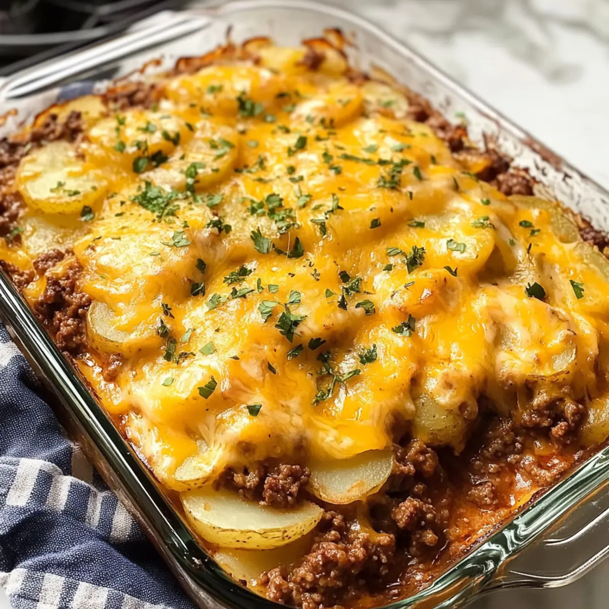 Lass den Rinderhackfleisch- und Kartoffelauflauf etwa 5 Minuten ruhen, bevor du ihn anschneidest. Dies hilft, die Schichten zu festigen und das Servieren zu erleichtern. Garnieren kannst du den Auflauf nach Belieben mit frisch gehackter Petersilie für einen Farbtupfer.