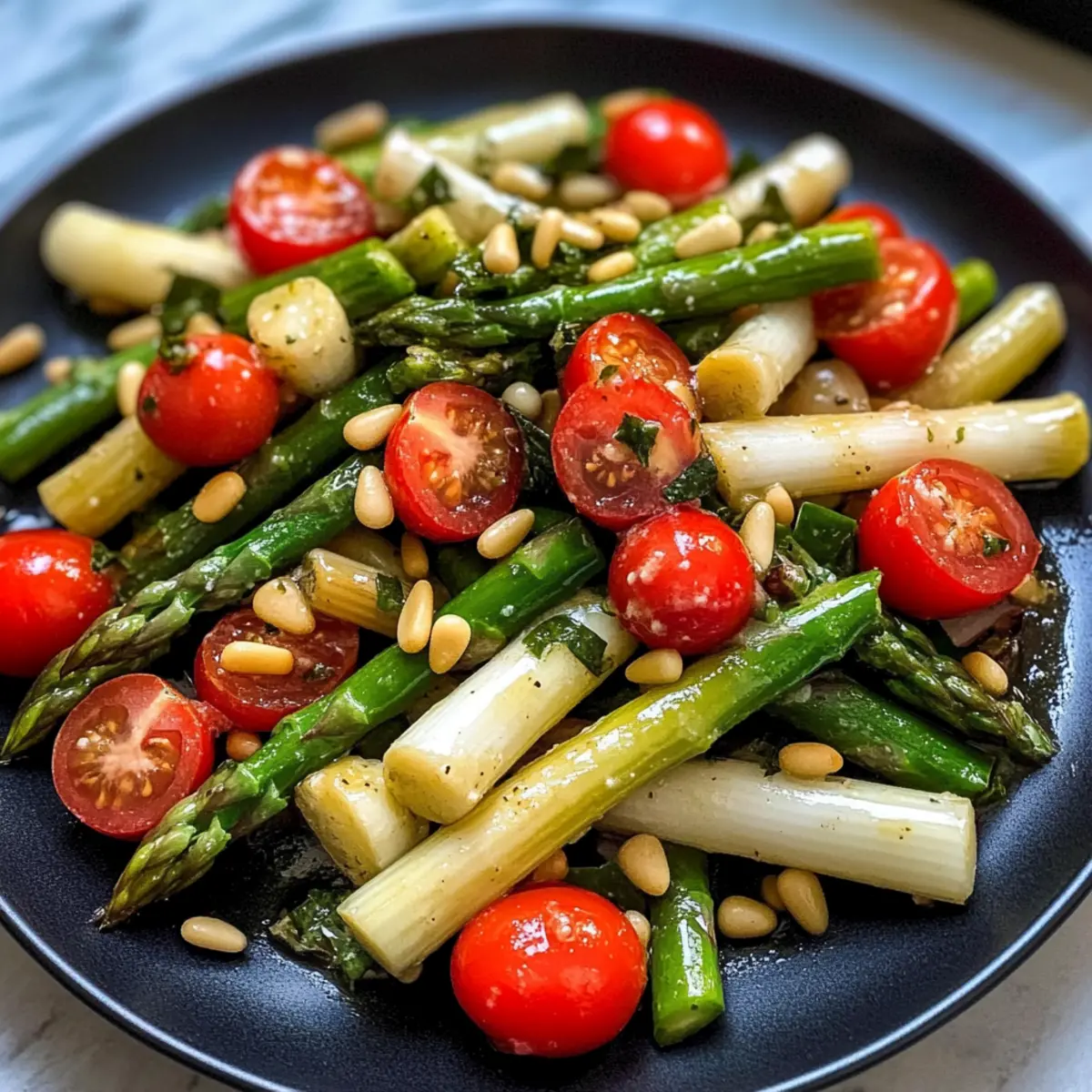 Frische Zutaten: Dieser Salat verwendet zarten, saisonalen Spargel und saftige Kirschtomaten, die ihn unwiderstehlich machen. Einfach zuzubereiten: In weniger als 30 Minuten ist dieser gesunde Leckerbissen fertig, ideal für hektische Tage. Vielseitigkeit: Serviere ihn als Beilage zu Grillgerichten oder genieße ihn solo als leichtes Mittagessen. Knackige Texturen: Die Kombination aus knackigem Spargel und nussigen Pinienkernen sorgt für ein perfektes Geschmackserlebnis. Gesundheitsbewusst: Mit nur 82 kcal pro Portion passt er hervorragend in eine ausgewogene Ernährung. Machen Sie sich bereit, mit diesem Spargelsalat Ihre Familie und Freunde zu beeindrucken!