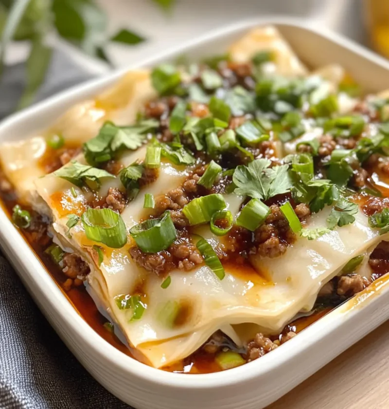 Nachdem die Teigtaschen-Lasagne fertig gegart ist, nimm sie vorsichtig aus dem Dampf und lass sie kurz abkühlen. Garniere das Gericht mit Chili-Crisp und zusätzlich geschnittenen Frühlingszwiebeln, um Frische und Textur hinzuzufügen. Deine köstliche Teigtaschen-Lasagne ist nun bereit zum Genießen!